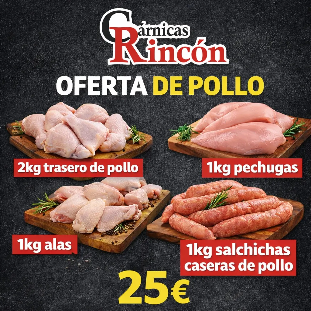 Pack variado de pollo, una oferta ideal para familias. El lote de carne de pollo incluye 2kg de trasero de pollo, 2kg de pechugas, 1kg de alas y 1kg de salchichas caseras de pollo, todo por solo 25 €, con la facilidad de recibir en casa y envasado al vacío.
